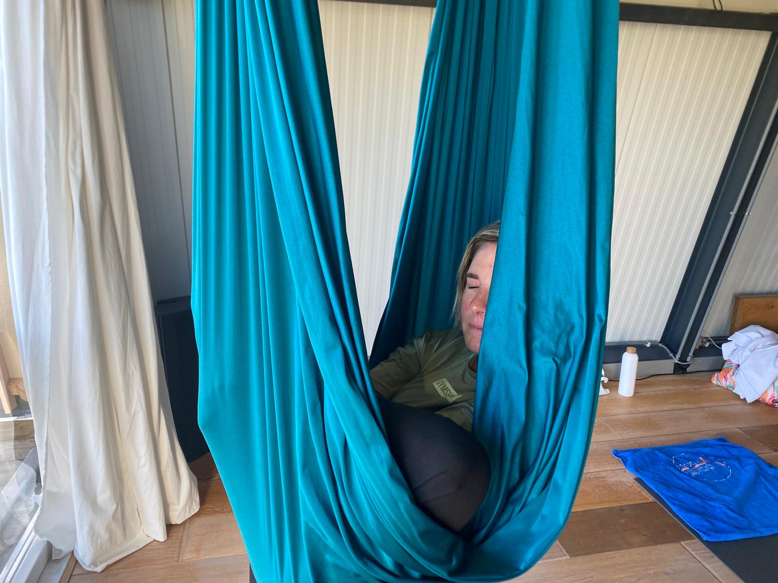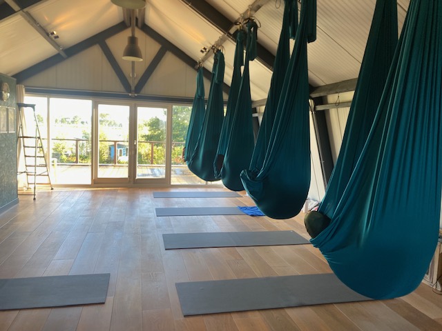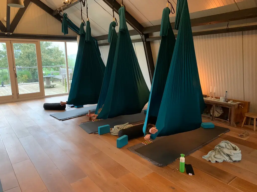 Aerial Yin Yoga combineert Yin houdingen met een aerialdoek (ofwel een hangmat). Met behulp van deze aerialdoek worden zittende en liggende oefeningen uitgevoerd. Hierdoor kun je nog meer ontspannen en dieper in de houding komen. Deze rustige yoga vorm heeft maximaal zes plaatsen – vanwege het aantal hangmatten.
